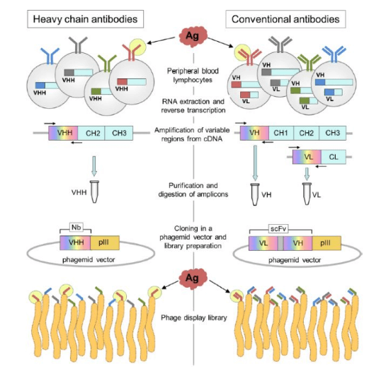 HH序列,同時(shí)也引入酶切位點(diǎn)方便下一步實(shí)驗(yàn)。擴(kuò)增出的抗體序列連接到載體上,其余的步驟同普通的構(gòu)建抗體庫(kù)的過(guò)程。具體流程見(jiàn)下圖。一般納米抗體庫(kù)容量可以比較容易達(dá)到10e8或10e9,多樣性大于95%。同時(shí)由于VHH只有一個(gè)可變區(qū),庫(kù)容在10e6時(shí)也能篩選到特異性抗體。但是在普通的抗體Fab 或者ScFv庫(kù)中,需要庫(kù)容足夠大才能更容易地篩選得到抗體。