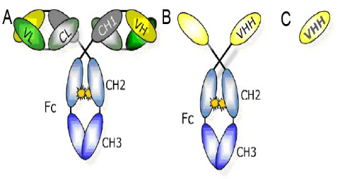 C圖:穩(wěn)定的可結(jié)合抗原的最小單位VHH也稱(chēng)Nanobody