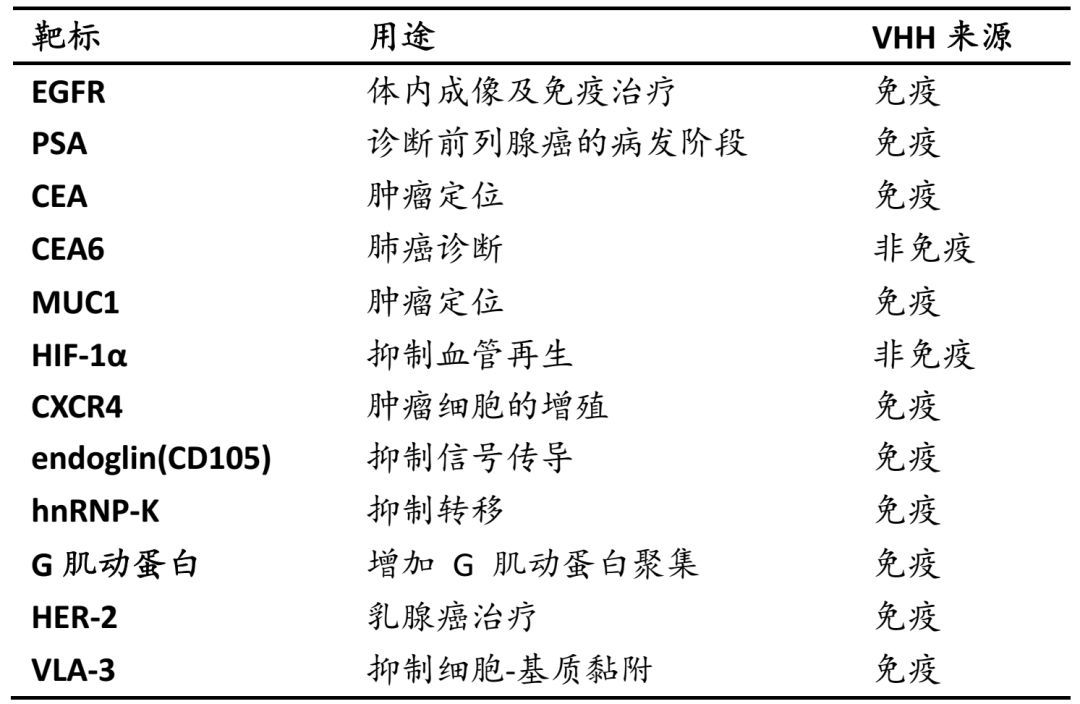 藥企相繼開發(fā)了靶向EGFR、HER2、VEGFR2、c-Met、CXCR7等抗腫瘤納米抗體。