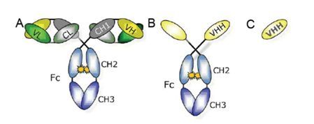 (A) 傳統(tǒng)四鏈結(jié)構(gòu)抗體; (B) 駱駝血液中的重鏈抗體; (C)穩(wěn)定的可結(jié)合抗原的最小單位VHH即納米抗體