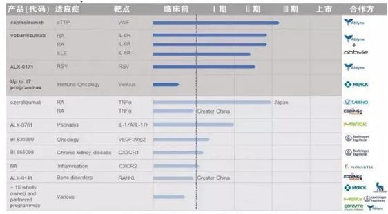 Ablynx擁有多達(dá)40多個(gè)候選藥物,應(yīng)用于癌癥、自身免疫病、呼吸系統(tǒng)疾病、血液系統(tǒng)疾病等多個(gè)不同領(lǐng)域。Ablynx在納米抗體領(lǐng)域擁有絕對的領(lǐng)導(dǎo)地位,截止2017年9月,已累計(jì)與輝瑞、禮來、諾華、勃林格殷格翰、賽諾菲等國際藥企達(dá)成超過70億歐元的合作。