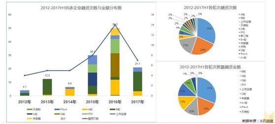 抗體產(chǎn)業(yè)的熱度也吸引了眾多的資本介入,從2012年到2017年上半年抗體藥物企業(yè)共披露融資次數(shù)47次,涉及融資金額達(dá)130億元。從披露投融資情況看,從2015年開始,抗體產(chǎn)業(yè)不管是從融資次數(shù)還是融資金額上都有大幅提升,產(chǎn)業(yè)熱度居高不下,融資次數(shù)和融資金均以A輪和B輪居多,提示我國抗體產(chǎn)業(yè)仍處于上升階段。