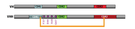 納米抗體VHH表面大概只有10個(gè)氨基酸和人VH不同,其中在FR2位置有四個(gè)特異的氨基酸:普通抗體的FR2中V37、G44、L45和W47這4個(gè)氨基酸殘基是在進(jìn)化中相當(dāng)保守的疏水性殘基;而在VHH中,它們突變?yōu)橛H水性的氨基酸殘基F37、E44、R45、G47,增加了VHH的溶解性。VHH的CDR1區(qū)和骨架區(qū)FR2存在半胱氨酸殘基(Cys),可以和CDR3區(qū)中的Cys殘基形成二硫橋,增加了可變區(qū)的穩(wěn)定性和結(jié)構(gòu)變化。