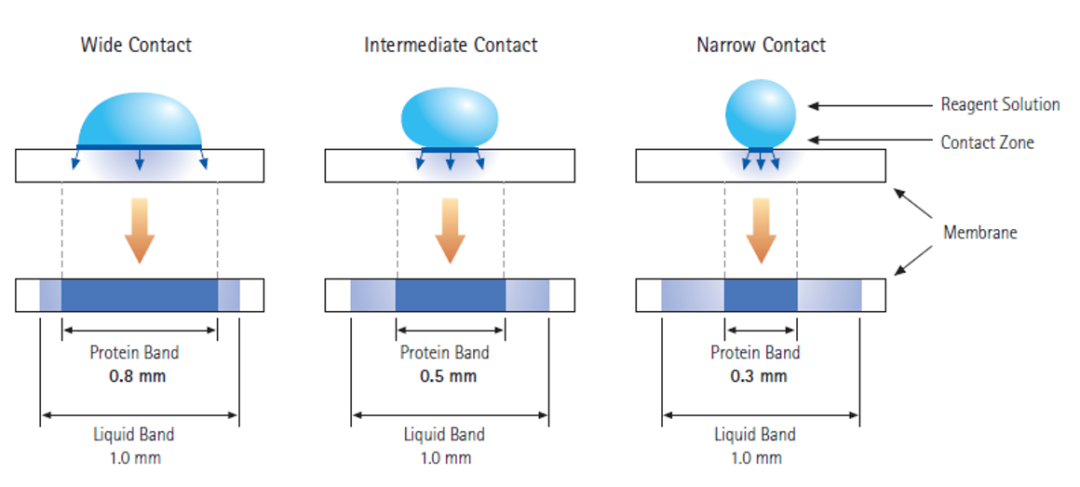 這么多抗體,怎么才能讓它們擠在一起呢?為啥要擠一起?因?yàn)閳F(tuán)結(jié)就是力量。只要抗體沒(méi)有過(guò)量,那么噴灑抗體的管線與膜接觸的越少就越細(xì)。真是顯而易見的結(jié)論,哈哈。