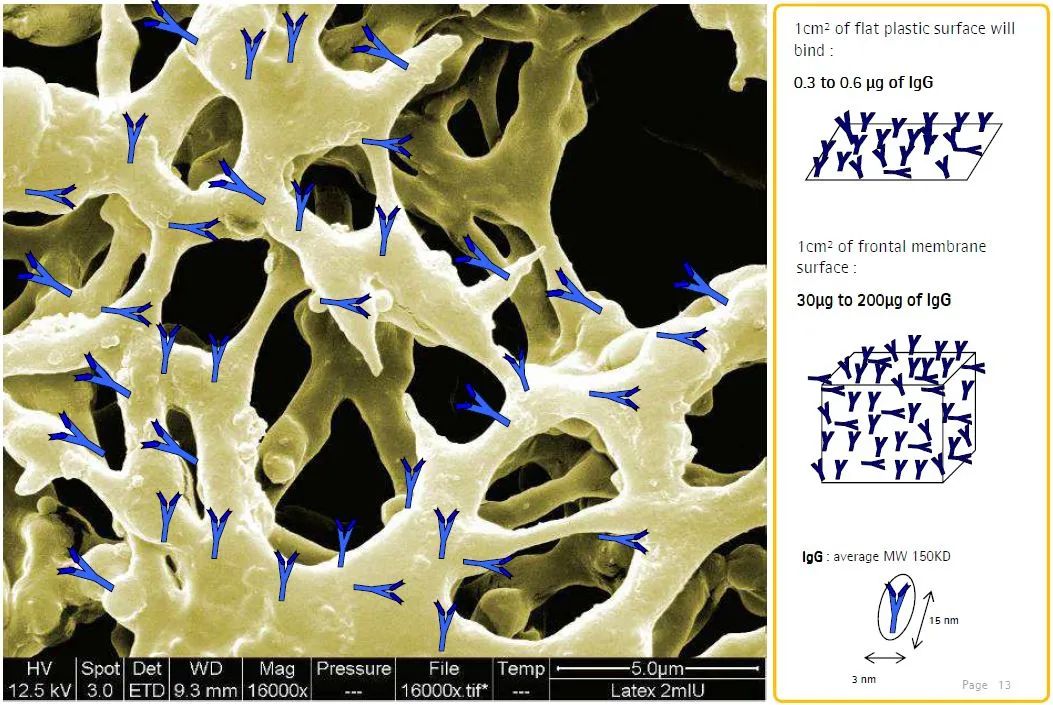 除了膠體金微球上要裹上抗體,膜上也要噢。別看膜上能包裹抗體的量是按ug算的。按個(gè)算,1平方cm要包裹0.12億億個(gè)抗體?。?!