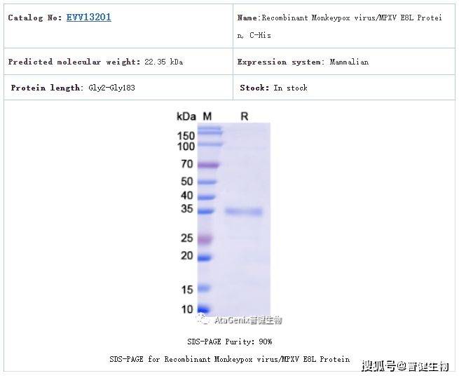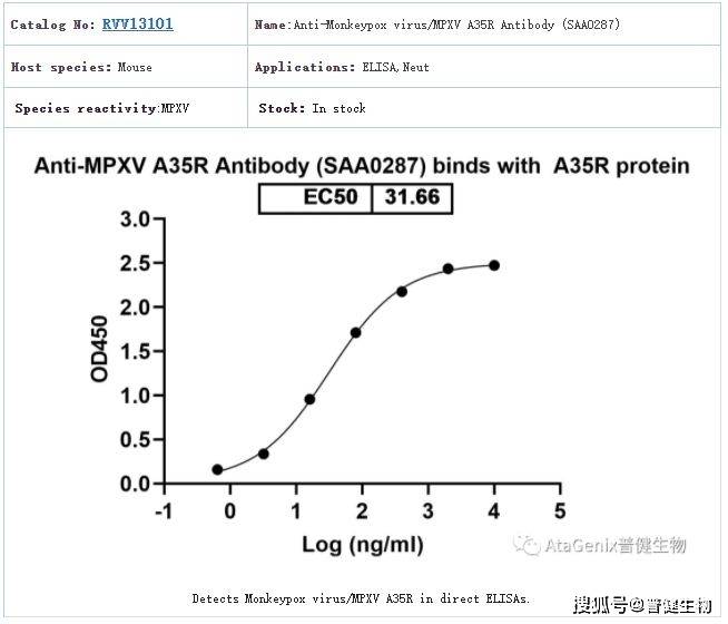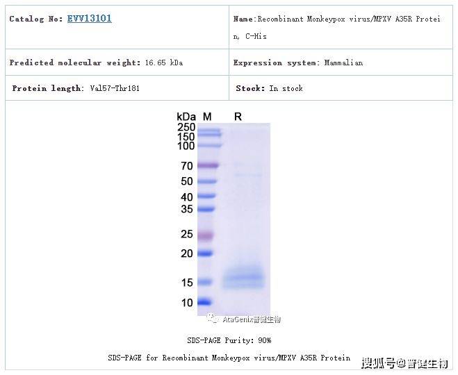 A35R是細(xì)胞內(nèi)包膜病毒粒子(IEV)和細(xì)胞外包膜病毒粒子(EEV)的包膜成分,與脊索痘病毒A33R同源。痘苗病毒中的A33R在病毒粒子在細(xì)胞間的傳播中起著至關(guān)重要的作用,是疫苗開(kāi)發(fā)的重要靶點(diǎn),也有研究表明A35R是猴痘病毒(Monkeypox virus,MPXV)血清學(xué)檢測(cè)的潛在靶點(diǎn)。