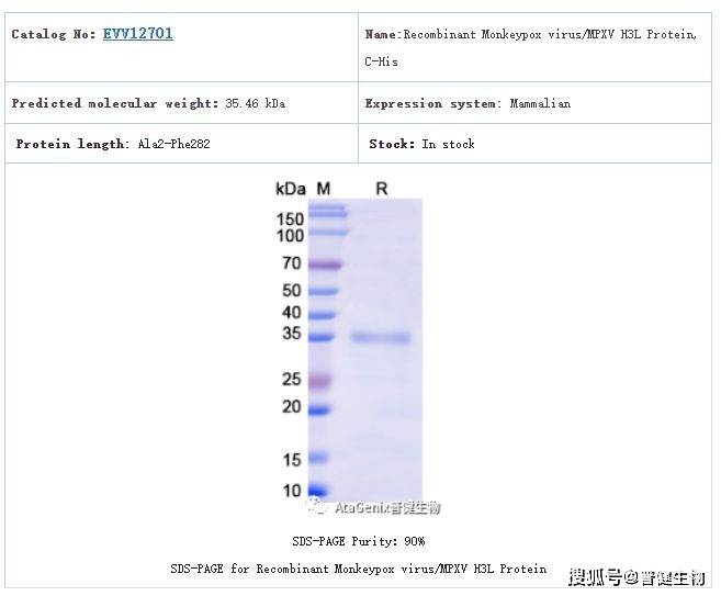 H3L是一種324個(gè)AA長(zhǎng)的糖基轉(zhuǎn)移酶,位于病毒包膜上,在與宿主細(xì)胞的附著和隨后的痘病毒進(jìn)入中起關(guān)鍵作用。研究表明,天花疫苗誘導(dǎo)的抗體與H3蛋白結(jié)合,分化簇 (CD8)+ T細(xì)胞將H3L識(shí)別為抗原,表明其免疫學(xué)意義。