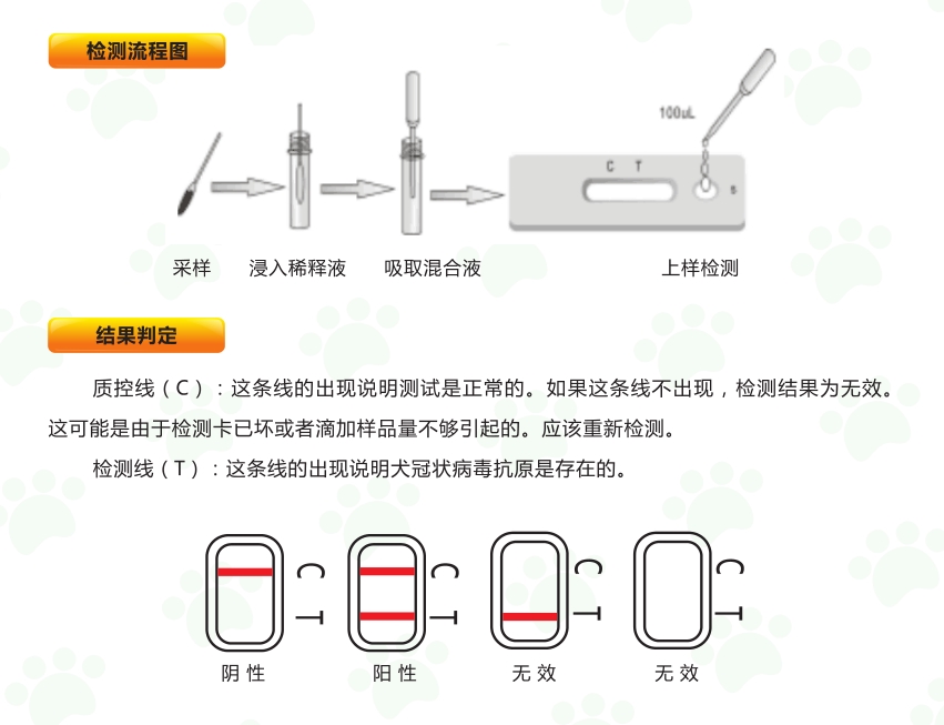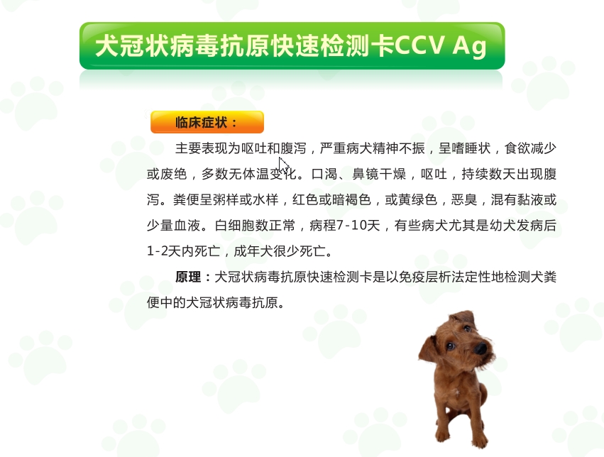 7) 本檢測(cè)卡僅供獸醫(yī)對(duì)犬病的體外快速診斷所用。該檢測(cè)卡 能極為精確地檢測(cè)犬冠狀病毒抗原,但也會(huì)發(fā)生極低的錯(cuò)誤結(jié)果。醫(yī)生應(yīng)綜合臨床癥狀或其他臨床檢測(cè)方法進(jìn)行確診。