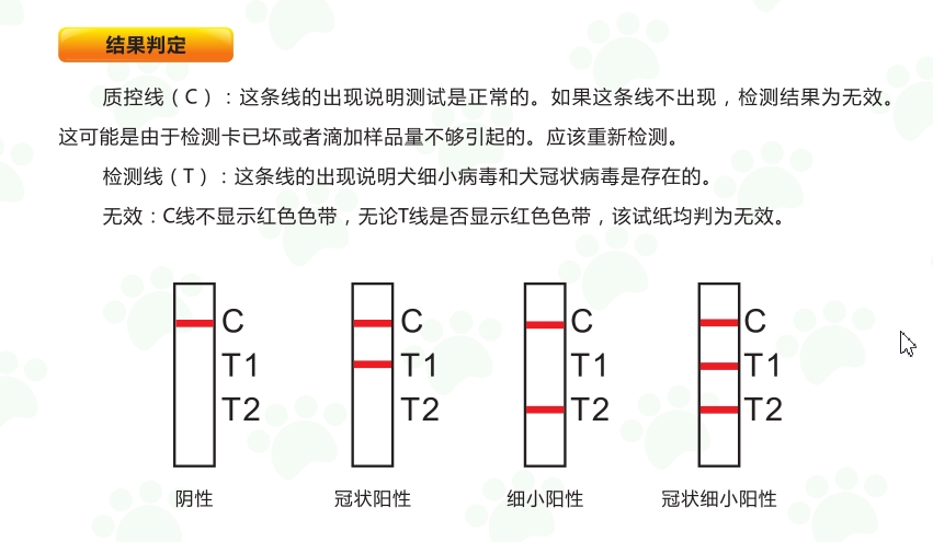 犬細小/犬冠狀病毒快速檢測試紙基于膠體金免疫層析技術。檢測時,樣品中的犬細小/犬冠狀抗原與膠體金包被的單抗結合形成抗原抗體復合物,并沿著試紙流向NC膜的另一端。當該復合物流到膜上的T區(qū)時,固定在膜上的特異性抗體捕獲該復合物并逐漸凝集成一條可見的T線,未結合的膠體金抗體流過T區(qū)被C區(qū)的二抗捕獲并形成可見的C線。C線出現(xiàn)則表明免疫層析發(fā)生,即試紙有效;T線出現(xiàn)則表明樣品中含有犬細小/犬冠狀病毒。