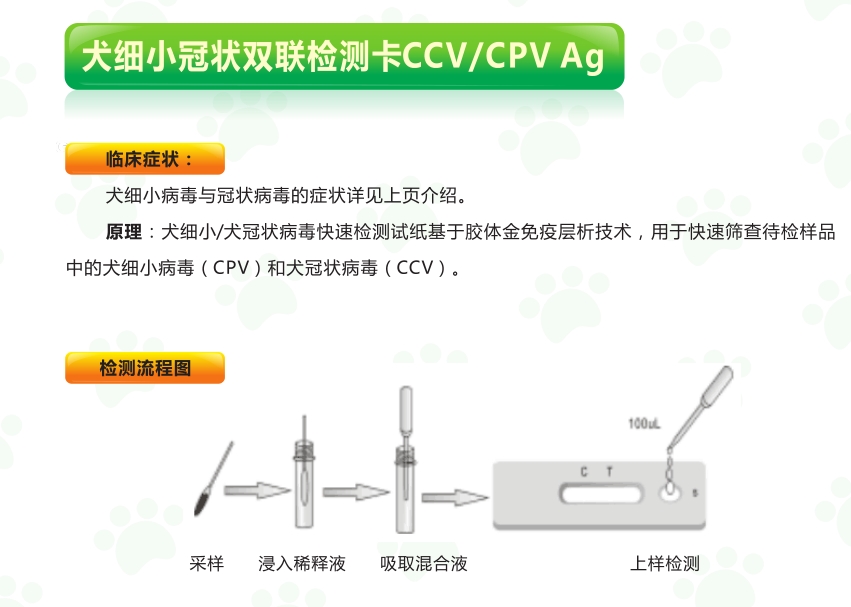 用于快速篩查待檢樣品中的犬細小病毒(CPV)和犬冠狀病毒(CCV)。